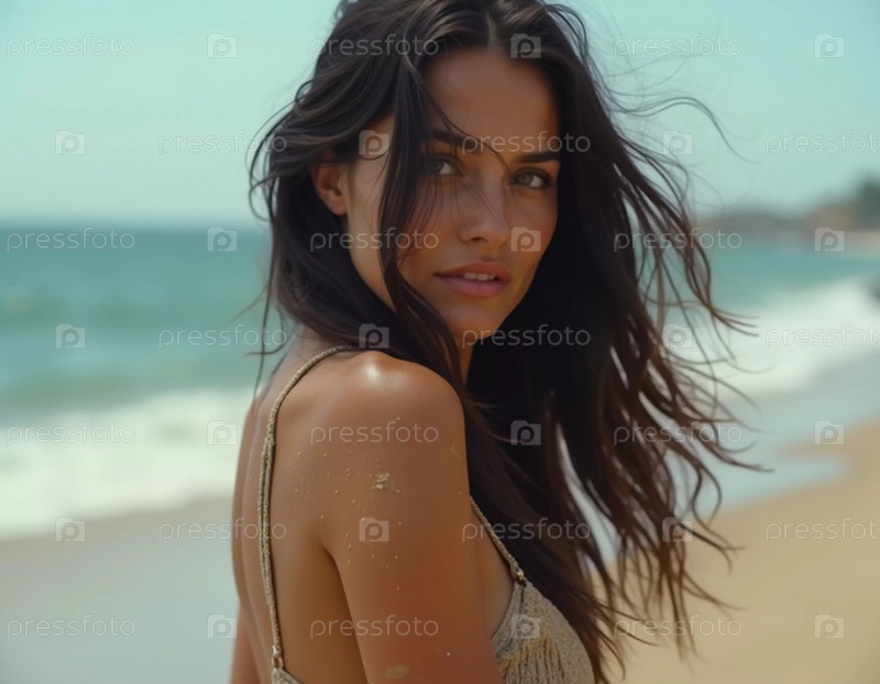 Брюнетка в купальнике смотрит назад, стоя возле береговой линии. Нежные морские волны обнимают ее у ног под чистым голубым небом. Длинные волосы, красивое молодое лицо. Путешествия и реклама одежды