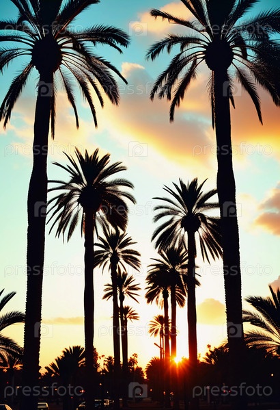 Силуэты пальмовых деревьев поднимаются на фоне потрясающего захода солнца, где огненно-оранжевый встречается с спокойным синим, создавая захватывающую дыхание тропическую панораму, которая покоряет сердце Generative AI