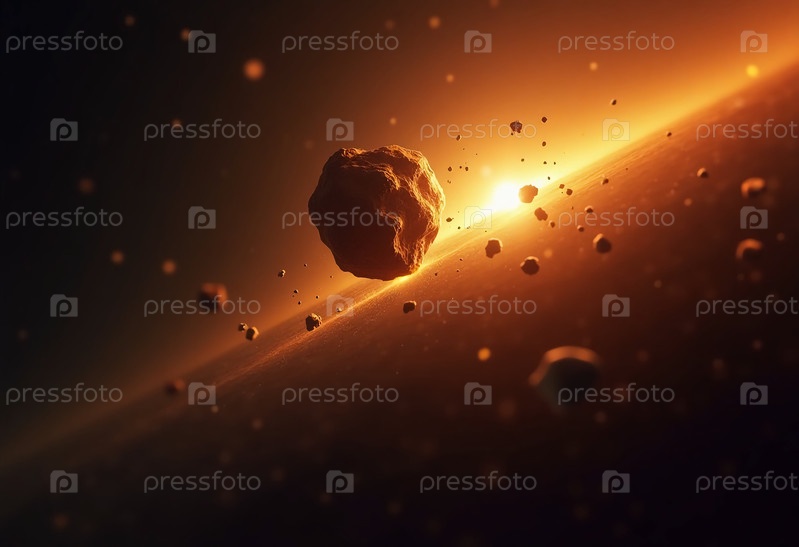 Астероиды грациозно скользят среди космической пыли, освещенные теплом золотых лучей далекой звезды, создавая очаровательное небесное зрелище в обширной Вселенной