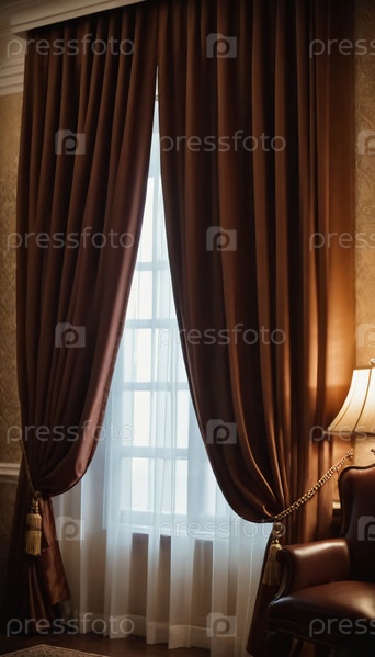 Роскошные шелковые шторы в богатых коричневых оттенках элегантно обрамляют окно, мягко рассеивая солнечный свет в изысканный интерьер