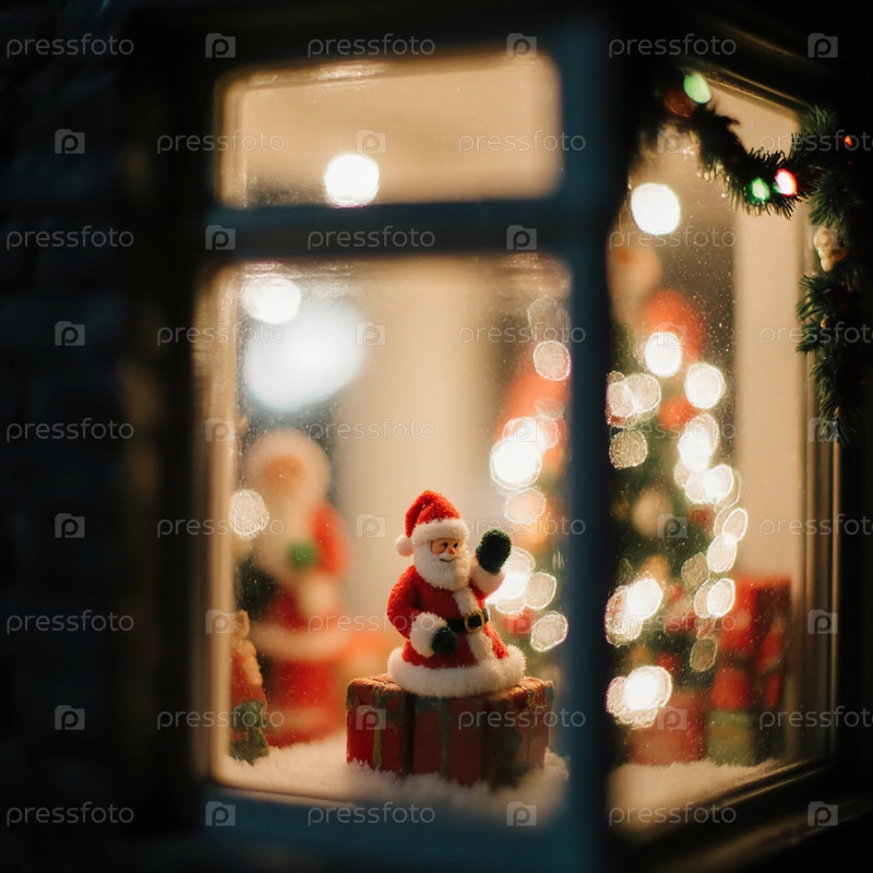Яркий и веселый праздничный дисплей в окне показывает Санта-Клауса, размахивающего среди мерцающих огней и украшенной рождественской елки