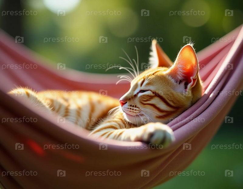 Пушистый оранжевый кот тихо и спокойно дремлет в мягком гамаке, окруженный пышной зеленью и нежными солнечными лучами спокойного дня Generative AI
