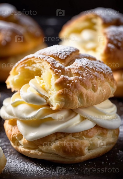 Тарелка с свежеприготовленными сливочными выпечками, каждая из которых покрыта сахарным порошком и кремовой начинкой, красиво расположена в мягком вечернем освещении, приглашая любителей десертов насладиться