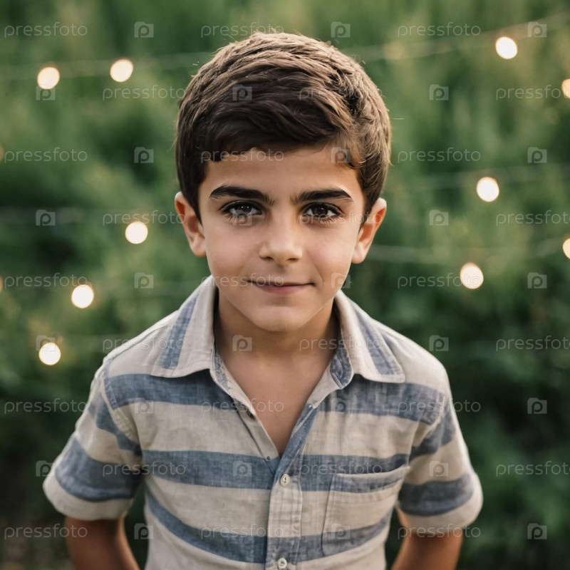 В спокойной обстановке на открытом воздухе молодой армянский мальчик с увлекательными глазами позирует уверенно, окруженный мягкими светящимися огнями, которые улучшают магическую вечернюю атмосферу Generative AI