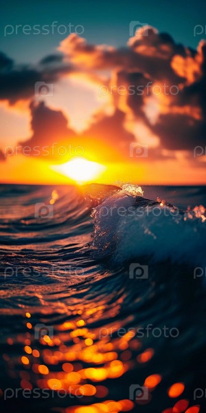 Горизонт светит яркими оранжевыми и красными цветами, поскольку волны мягко врезаются в берег, отражая теплые цвета заходящего солнца на спокойной поверхности океана