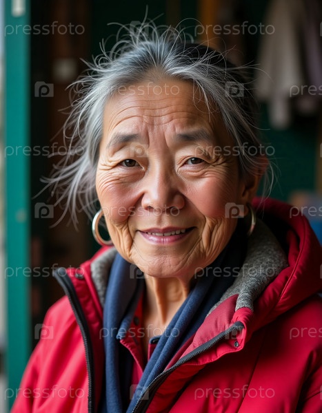 Пожилая женщина-коренной жительница Аляски тепло улыбается, демонстрируя свое культурное наследие через элегантную одежду Generative AI
