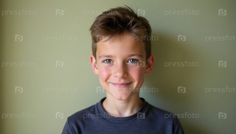 Молодой мальчик уверенно стоит, одет в простую серую футболку и излучает счастье