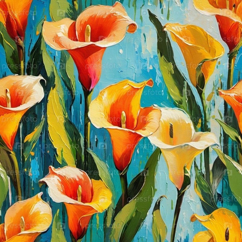 Ярко окрашенные лилии калла в оттенках красного, желтого, апельсинового и фиолетового цветов заполняют холст среди пышных зеленых листьев на ярком синем фоне, создавая привлекательный цветный дисплей