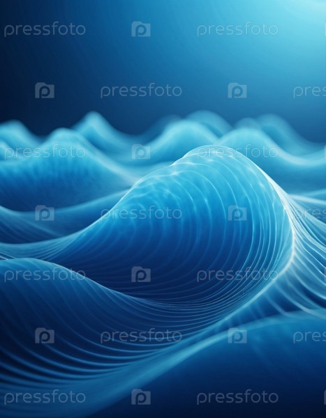 Текущие 3D-синие волны создают абстрактное представление о динамике жидкостей, вызывая спокойствие и глубину в минималистичном дизайне, который повышает цифровое творчество