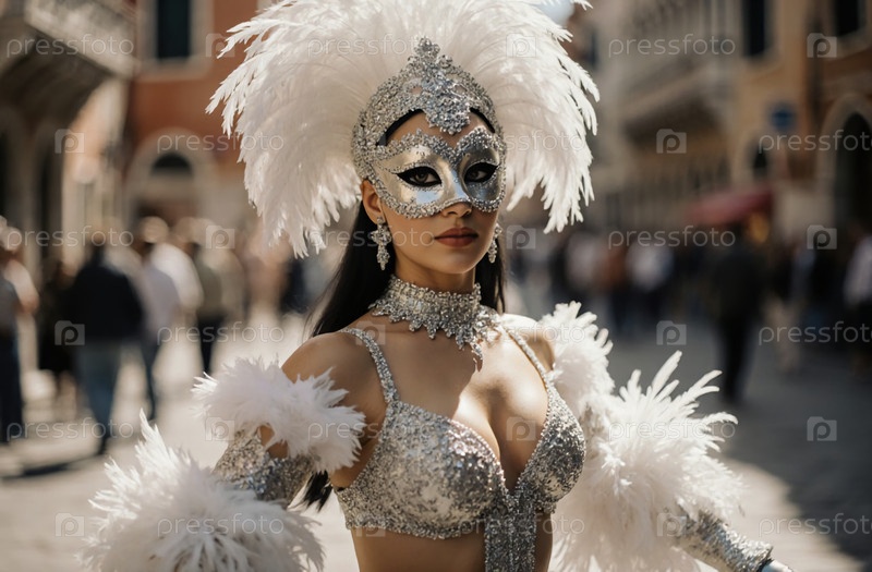 Потрясающая женщина в ослепительном серебряном костюме гордо стоит среди оживленной атмосферы Венецианского карнавала Generative AI