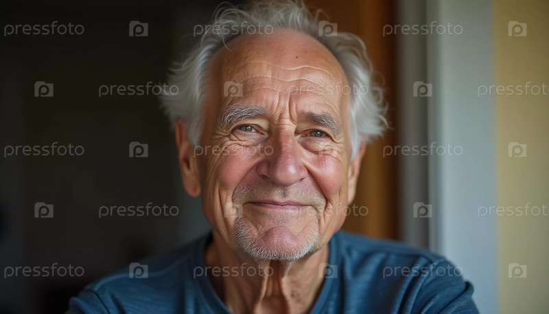 Пожилой мужчина, житель США, с белыми волосами радостно демонстрирует свое дружелюбное поведение в непринужденной одежде. Теплая внутренняя среда усиливает его приглашающую улыбку. Генеративный ИИ