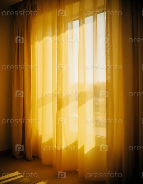Ярко-желтые шторы аккуратно вспыхивают, когда мягкий солнечный свет попадает в комнату, создавая теплую и гостеприимную атмосферу поздним днем Generative AI