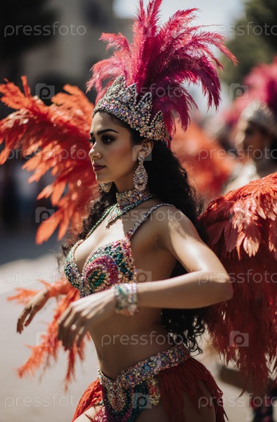 Мексиканская танцовщица карнавала в ярком костюме с перьями празднует традиции и культуру во время оживленного фестиваля на солнечной площади генеративный AI