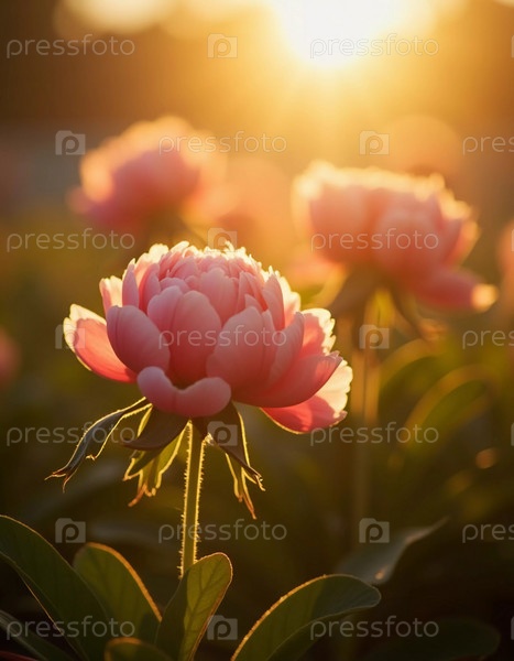 Живые цветы пионки в розовых оттенках стоят высоко, когда на заднем плане заходит золотое солнце, создавая спокойный и атмосферный пейзаж, наполненный теплом