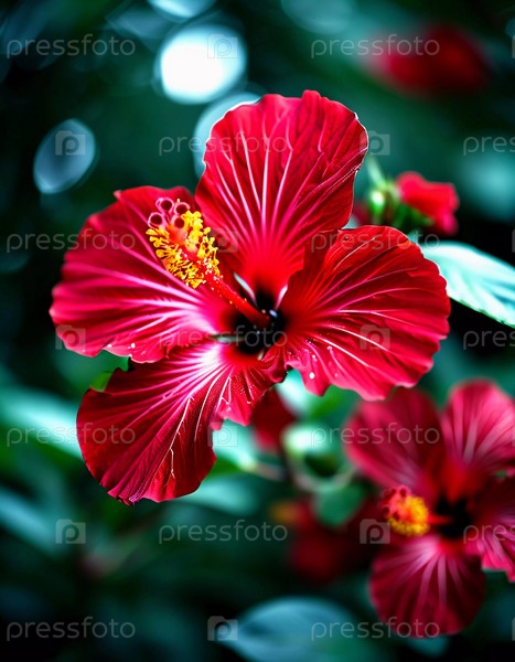 Ярко-красные цветы гибискуса демонстрируют сложные лепестки в процветающем саду. пышная зелень создает яркий фон для их красоты