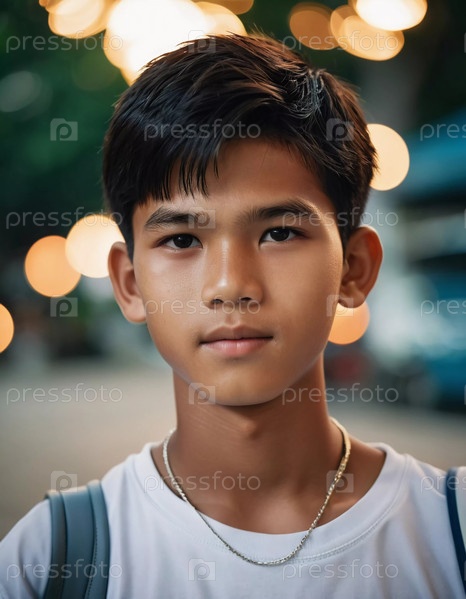 Мальчик в возрасте около десяти лет был замечен на открытом воздухе в Таиланде, стоял неподвижно и смотрел с уверенностью.Фон украшен мягкими размытыми городскими огнями, создающими яркую атмосферу