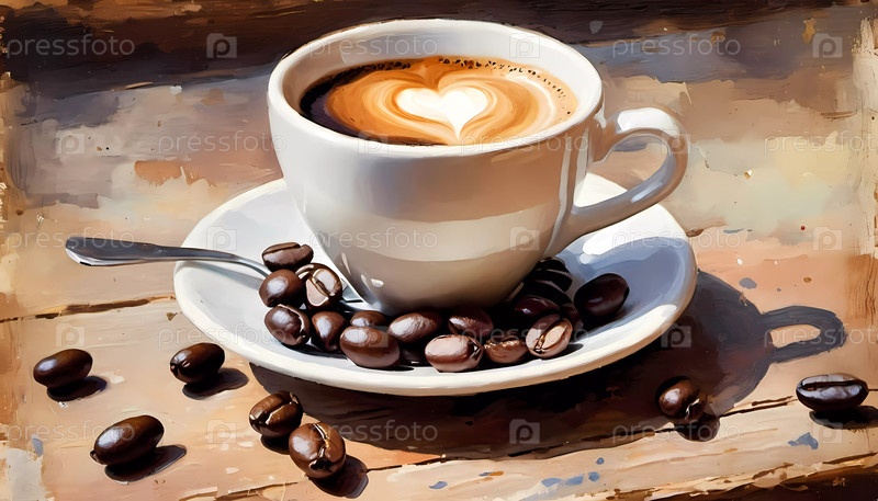 Теплый эспрессо-кофе подается в очаровательной белой чашке с дизайном сердца, на тарелке из кофейных зерен над винтажным деревянным столом в уютной атмосфере. ретро рисует стилизованную картину. генеративный AI