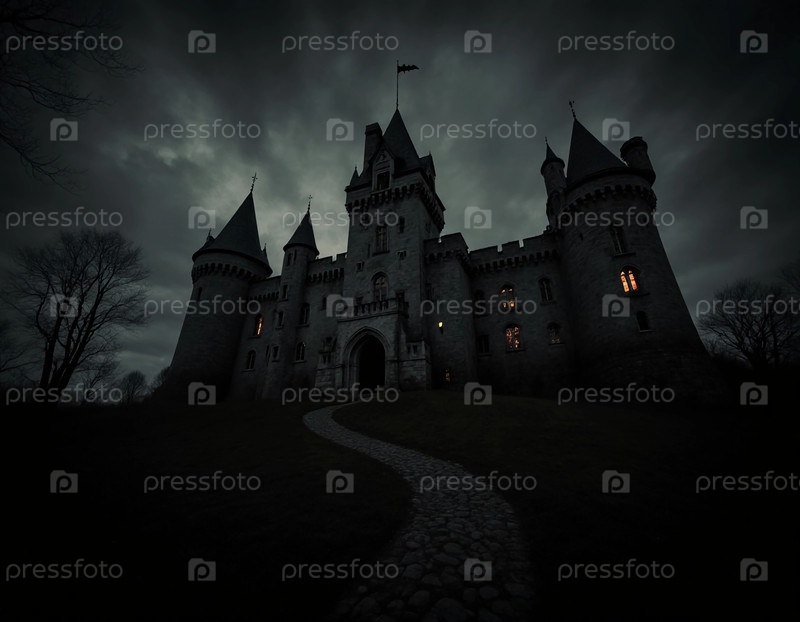 Вампирский замок стоит высоко на фоне темного, бурного неба в ночь Хэллоуина.Мигающие огни сияют из окон, добавляя к призрачной атмосфере генеративный ИИ