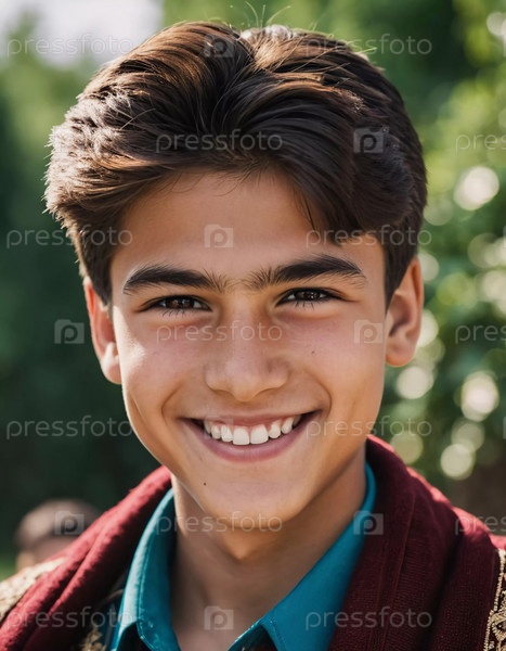 Веселый милый таджикский мальчик 18 лет сияет от счастья, когда он стоит в живописном пейзаже, окруженный красотой природы во время теплого золотого часа света. Счастливый улыбающийся брюнетки парень. ИИ генерируется