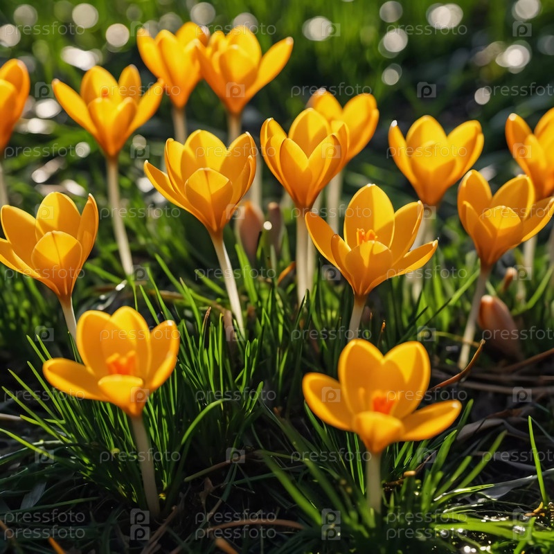 Нежные желтые цветы крокуса расцветают в пышной зеленой траве, солнечный свет в тихой весенней обстановке Возрождение природы Шафран Крокус - род многолетних луковичных травных растений семейства Iris Iridaceae