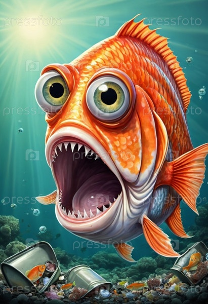 Большая рыба с преувеличенными выпуклыми глазами реагирует в ужасе, когда плывет по загрязненному району, заполненному отброшенным мусором, демонстрируя последствия загрязнения воды