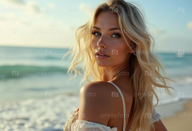 Блондинка в купальнике смотрит назад, стоя рядом с береговой линией.Нежные морские волны обнимают ее у ног под чистым голубым небом.Длинные волосы, красивое молодое лицо.Путешествия и реклама одежды