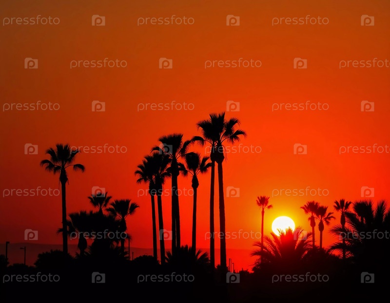 По мере того как солнце опускается за горизонт, силуэт пальмовых деревьев на фоне захватывающего оранжевого неба создает волшебный момент, который вдохновляет на спокойствие и размышления