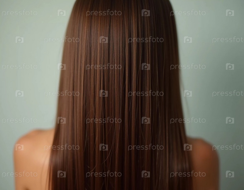 Гладкие, прямые коричневые волосы элегантно протекают вниз по спине, подчеркивая его здоровый блеск и равномерный цвет, освещенные мягким освещением, создавая поразительный вид