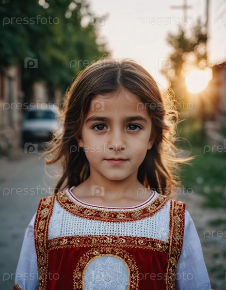 Молодая девушка спокойно стоит в традиционной армянской одежде, ее выразительные глаза отражают золотые оттенки заката