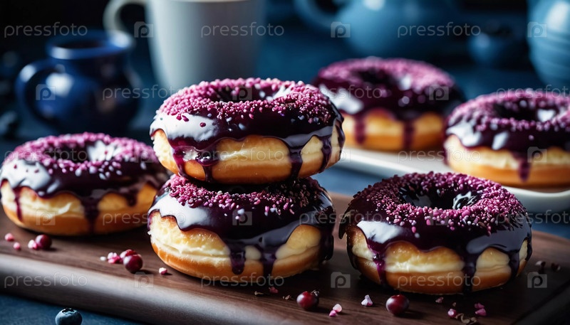 Соблазнительная куча свежеприготовленных голубиных филевых пончиков с богатой глазурью, демонстрирующих яркие ягоды сверху, идеально подходит для желания десерта в любое время суток