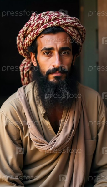 Молодой человек из Йемена, украшенный в традиционную одежду, сидит с созерцательным взглядом.Теплая атмосфера его окружения подчеркивает богатое культурное наследие региона Generative AI