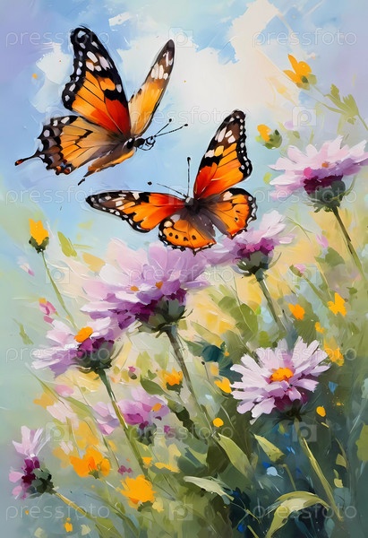 Красочные бабочки грациозно парили над ярким массивом диких цветов, создавая оживленную и веселую атмосферу на солнечном лугу