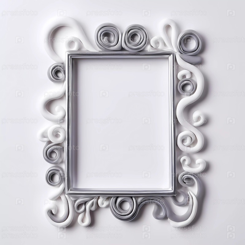 Декоративная прямоугольная рама демонстрирует уникальный дизайн с вращающимися узорами в белом и серебристо-сером цветах на гладком нейтральном фоне, идеально подходит для отображения произведений искусства