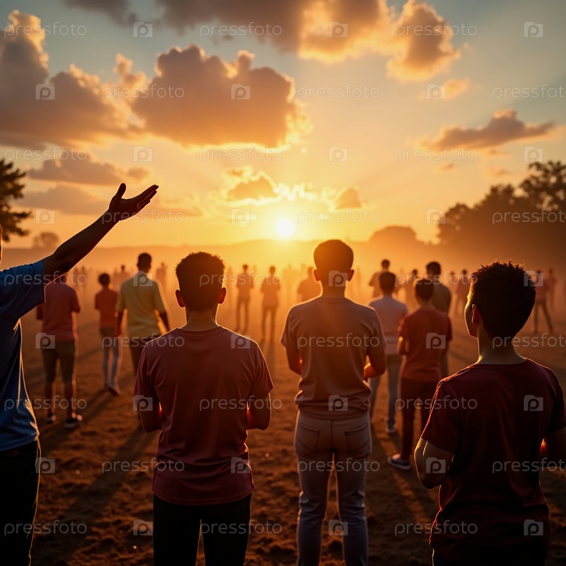 Когда заходит солнце, разнообразная группа собирается в молитве, оформив силуэт против сияющего горизонта, отмечая единство и веру в спокойную обстановку на открытом воздухе Generative AI
