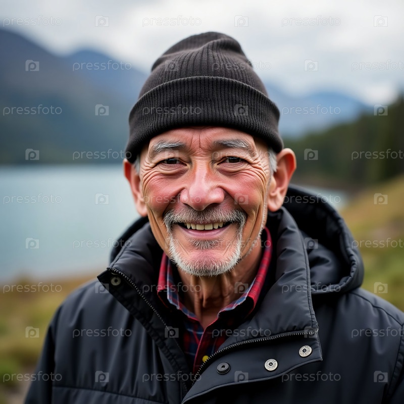 Старший коренной житель Аляски излучает мудрость и радость, когда стоит у спокойного озера, демонстрируя свое богатое культурное наследие среди захватывающих горных пейзажей под облачным небом Generative AI