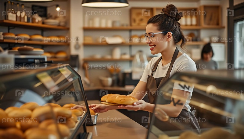 Улыбающийся пекарь держит теплый, хрустящий хлеб в очаровательной пекарне, наполненной различными продуктами для выпечки