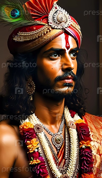 Богато украшенный Господь Кришна очаровывает зрителей своей спокойной грацией и сияющей одеждой, отражая глубокую любовь и мудрость во время духовного праздника Generative AI