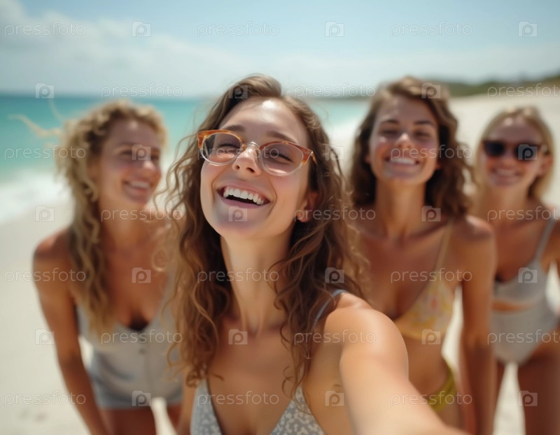 Друзья наслаждаются солнечным днем на пляже, улыбаясь и смеясь во время совместного запечатления веселого момента. Голубое небо дополняет их радостный дух и летнюю атмосферу. Белый песок. Генеративная ИИ
