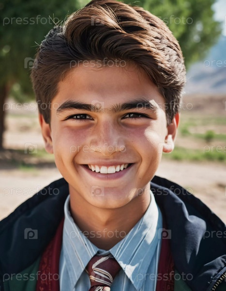 Веселый милый таджикский мальчик 18 лет сияет от счастья, когда он стоит в живописном пейзаже, окруженный красотой природы во время теплого золотого часа света. Счастливый улыбающийся брюнетки парень. ИИ генерируется