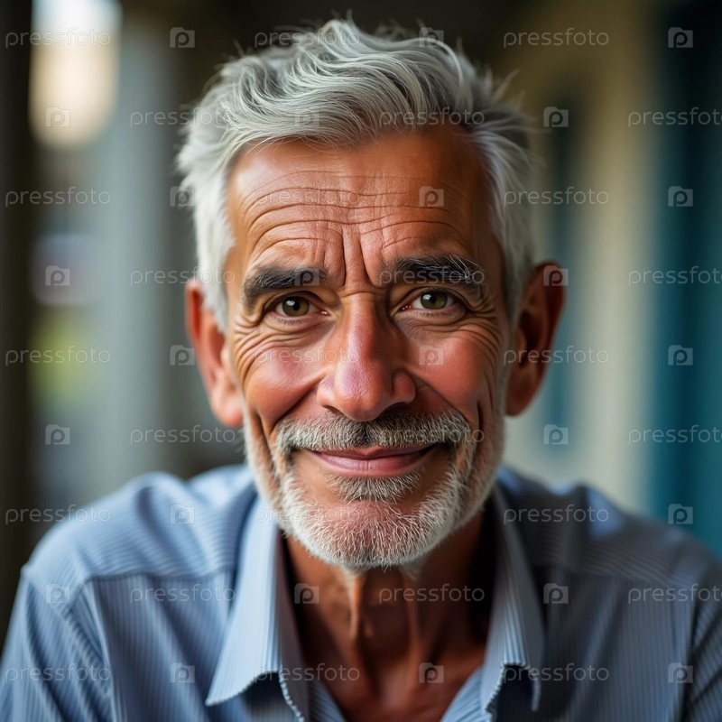 Бразильский мужчина шестидесятилетнего возраста стоит в оживленном городском месте, демонстрируя подлинную улыбку, которая отражает его жизненные переживания