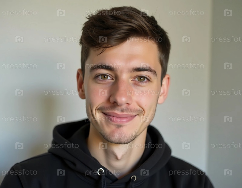 Молодой человек из Белоруссии демонстрирует дружелюбную улыбку на фоне мягко освещенного внутреннего фона, который добавляет теплую атмосферу
