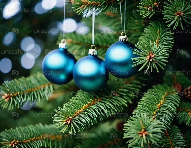 Красочные рождественские украшения украшают ветви пихты, яркие шары в оттенках синего, воплощающие праздничное настроение зимой