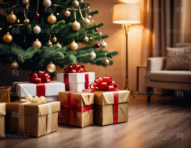 Празднично упакованные подарки в окружении красочных рождественских шаров под красиво украшенной пихтой во время радостного новогоднего сезона