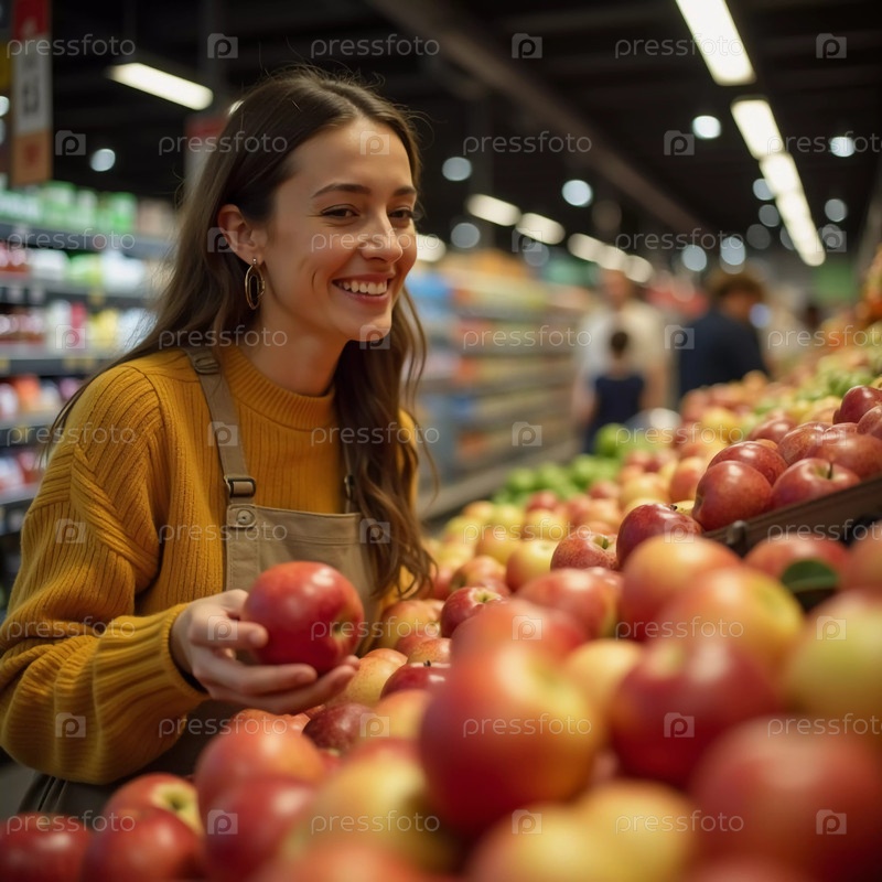 Веселая женщина аккуратно собирает яблоки из яркого дисплея в оживленном супермаркете, окруженный разнообразными красочными фруктами и покупателями