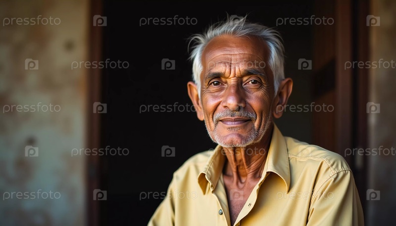 Пожилой человек спокойно сидит у двери своей резиденции в Индии, демонстрируя свою теплую улыбку и мудрое поведение