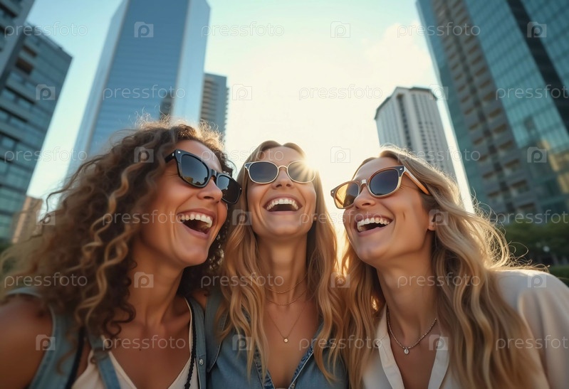 Трое друзей стоят у стеклянного окна, их улыбки излучают тепло и они смеются на фоне потрясающего горизонта