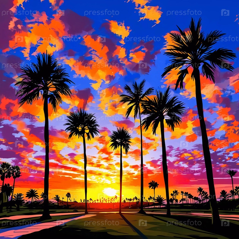 Золотые оттенки солнца опускаются ниже горизонта, излучая сияющее свечение на раскачивающихся пальмах Генеративный ИИ