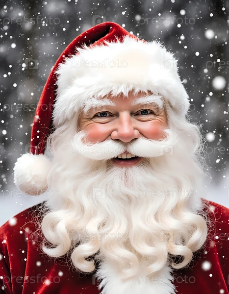 Санта-Клаус тепло улыбается, когда вокруг него падают снежинки. у него пушистая белая борода и красная шляпа. обстановка праздничная и отражает дух рождественского сезона Generative AI
