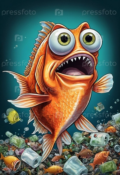 Большая рыба с преувеличенными выпуклыми глазами реагирует в ужасе, когда плывет по загрязненному району, заполненному отброшенным мусором, демонстрируя последствия загрязнения воды