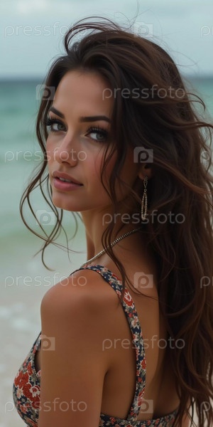 Брюнетка в купальнике смотрит назад, стоя возле береговой линии. Нежные морские волны обнимают ее у ног под чистым голубым небом. Длинные волосы, красивое молодое лицо. Путешествия и реклама одежды